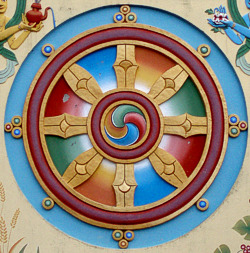 Het wiel heeft de acht spaken van het Achtvoudige Pad. |