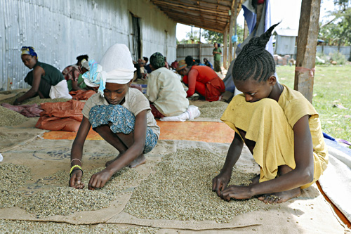 en jongeren helpen soms mee met het sorteren van koffiebonen die door de